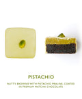 - Pistachio Brownie – Nutty brownie with pistachio praline, coated in premium matcha chocolate